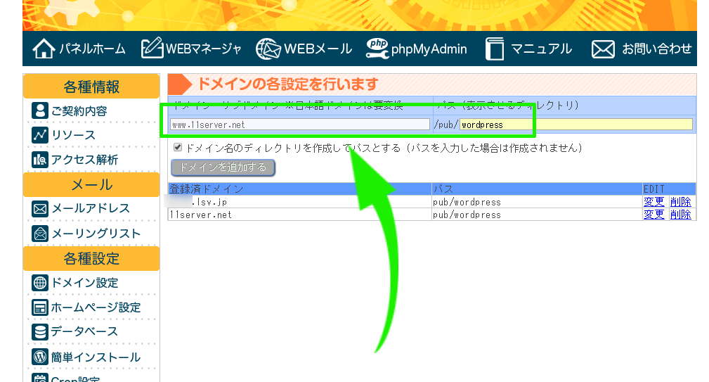 ドメイン欄には、wwwありの自分のドメインを入力します。ここでは、例としてwww.11server.netを入力しています。