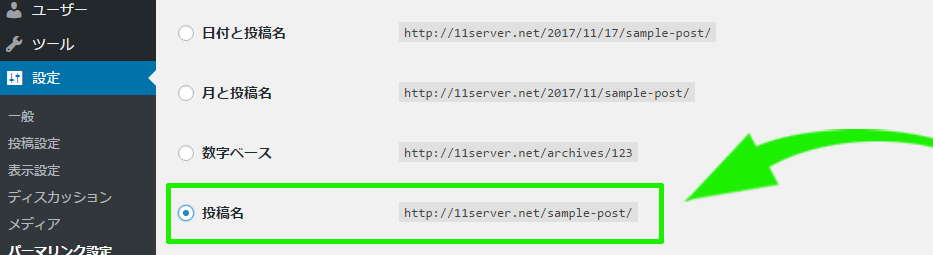 まず、ワードプレスの「設定」→「パーマリンク設定」で基本から「投稿名」に変更。「変更を保存」します。