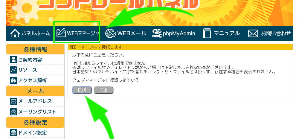 次に、リトルサーバーのコントロールパネルから「WEBマネージャ」を選択。WEBマネージャに接続します。別タブで開きます。