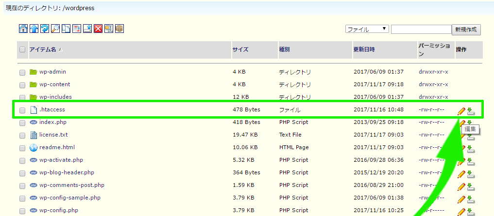 「wordpress」をインストールしてあるフォルダを開きます。その中に.htacces (エイチティーアクセス)ファイルがありますので、それを「編集」鉛筆アイコンをクリック。